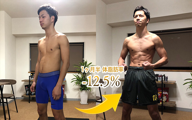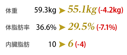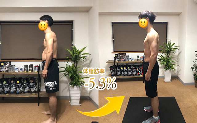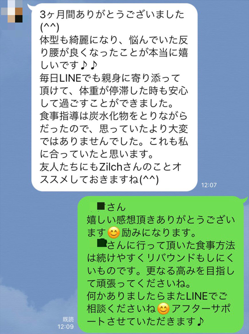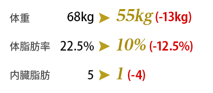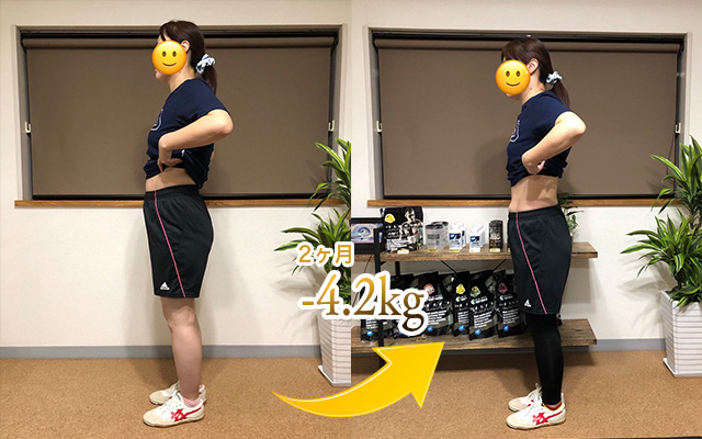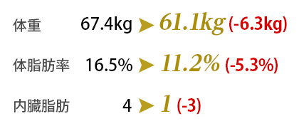 以前、他のパーソナルトレーニングで8キロ減量してから、停滞期に入ってる一番痩せにくい時にモニターで始めてもらったのですが、色々な食事法と毎回のトレーニングも、ストレスを溜めないように飽きのこない楽しくできるメニューを考案してくださって減量もできました!トレーニング後のケアもとても良くて全身が辛かったのが短期間でとても改善しました!